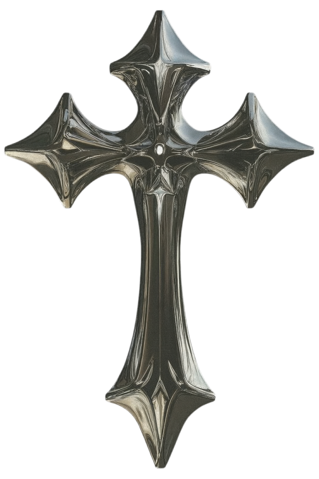 Bring the underground edge to any surface with the Oblivion Chrome Cross — a spiked, reflective emblem that cuts through the ordinary. Its mirror-polished vinyl captures light like metal, channeling both gothic energy and modern aggression.
