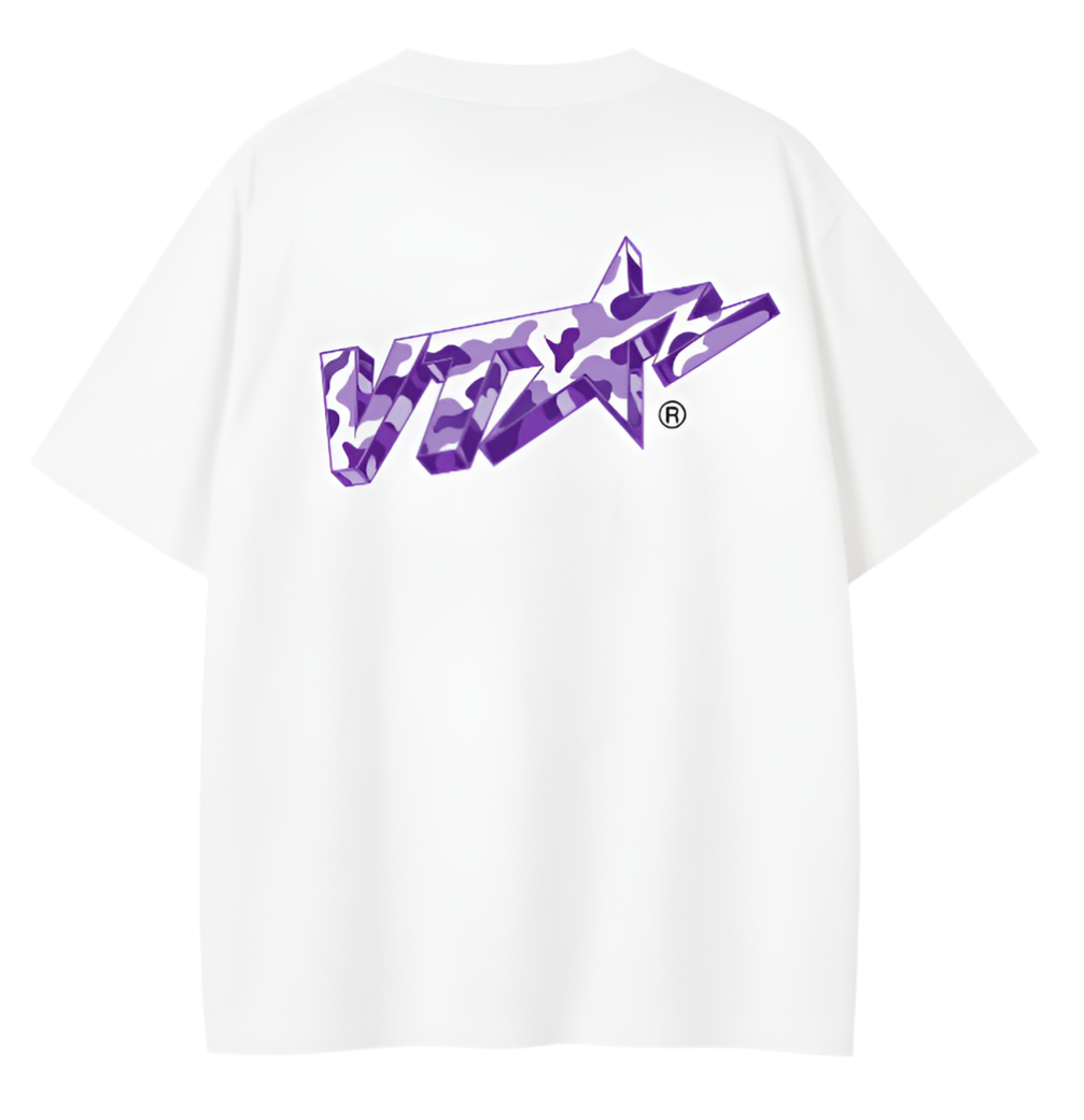 Level up your fit with the VeltrixWorks VTX Tee, featuring our bold star logo reimagined in a unique purple camo design. Clean and minimal from the front, with a statement graphic on the back — this piece blends streetwear energy with automotive-inspired attitude.